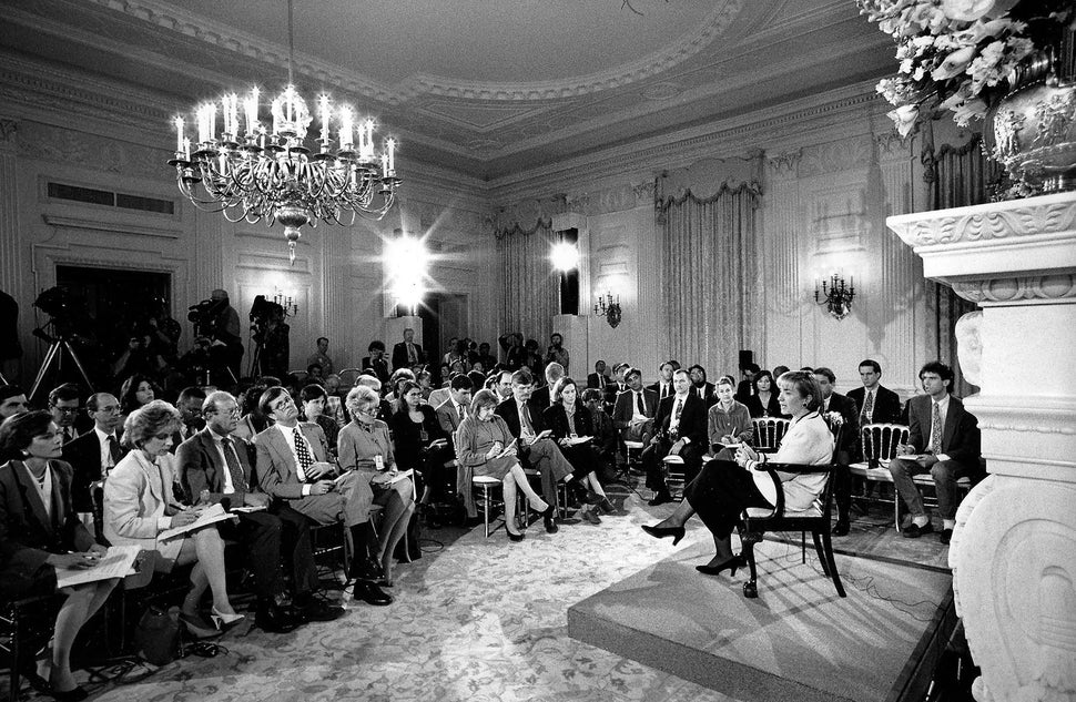 Addressing the press and taking questions on a wide range of topics in the East Room of the White House. The seventy-two-minute Q&A came months after reporters began demanding that Clinton discuss her role in criticized commodity trades and an Arkansas land deal first reported on in 1992. It was her only such event during her tenure as First Lady. April 22, 1994.