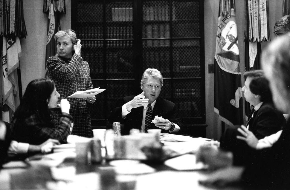 President Clinton and Hillary Clinton in a meeting about healthcare reform in the White House's Roosevelt Room. February 17, 1993.