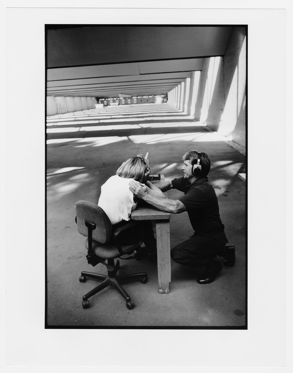 Firing a US Secret Service sniper rifle at a water-filled jug while touring the Secret Service training center in Beltsville, Maryland. The jug can be seen exploding down-range. October 4, 1997.