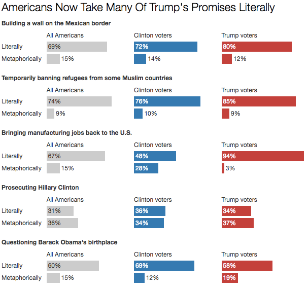 Voters who supported Trump in the election are, for the most part, especially prone to say that they take his words at face value. Seventy-eight percent believe he intends to carry out all the ideas he proposed, and more than 80 percent think he was being literal in his pledges to build a wall, keep out refugees and bring back manufacturing jobs.